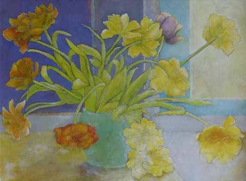 The extraordinary thing about a bunch of tulips is that they will go on growing when they are put in water. They find their own space and the stalks will twist and grow in all directions. As a flower subject they will last for long enough to work up a detailed painting, as with 'Yellow Tulips, Blue Stripey Jug’. However flowers always become more interesting as they fade and dry. Petals may appear waxy and thick but a source of light behind can cause delicate translucencies, the petals glow against a strong back light making them a compelling subject.